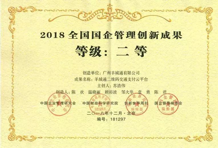 廣州公交集團白云公司申報的“順勢求變打造出租車企業運營新模式”項目,以及由廣州市人民政府國有資產監督管理委員會推薦申報的“羊城通二維碼交通支付云平臺”雙雙榮獲2018全國國企管理創新成果二等獎。